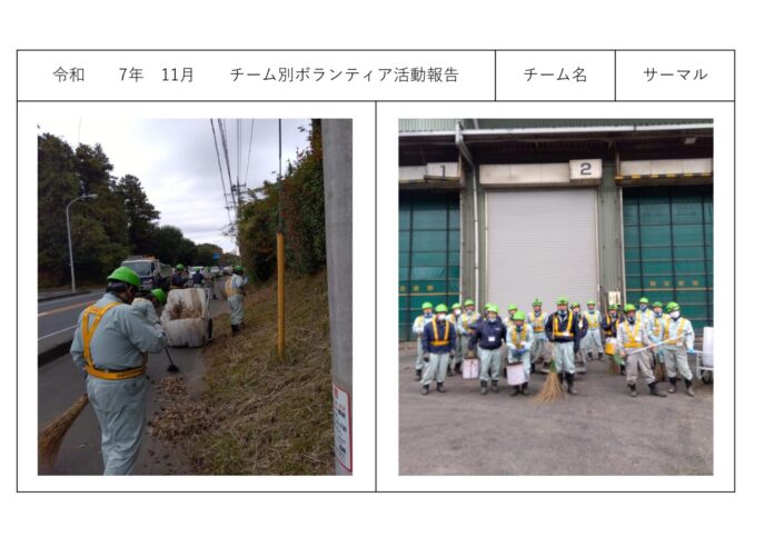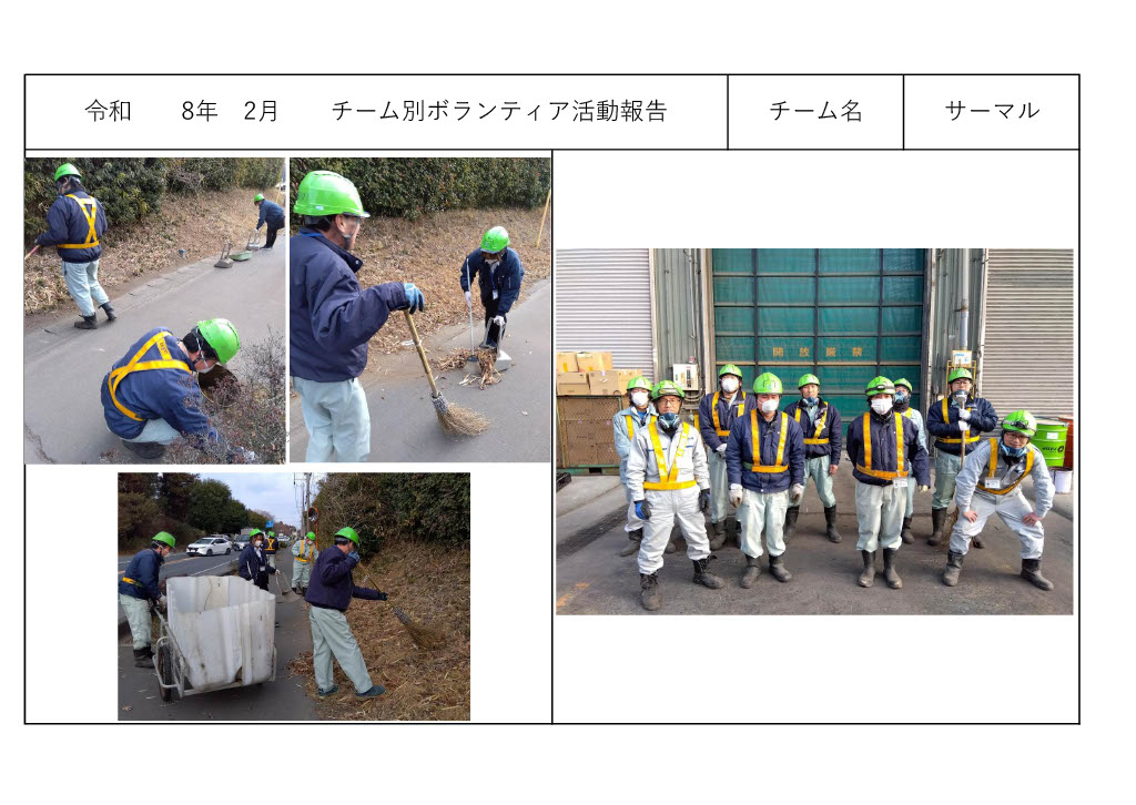 社内活動チーム別ボランティア活動<サーマルリサイクル課> 社内活動チーム別ボランティア活動<サーマルリサイクル課> チーム別ボランティア活動<サーマルリサイクル課> 2025年12月11日 周辺地域の清掃作業をチームごとに行っております。<サーマルリサイクル課> ◎2025年11月 ◎2025年10月 ◎2025年9月 ◎2025年8月 ◎2025年7月 ◎2025年6月 その他の記事 受入休止のお知らせ~12月15日(月)14:30~17:00 お知らせ 2025年12月11日 令和7年度 年末年始休業のお知らせと受入休止のお願い お知らせ 2025年12月11日 磯崎自治会主催「心と体の健康増進Fes.」ほかに協賛させて頂きました。 お知らせ 2025年10月6日 防災訓練のお知らせと受け入れ停止ご協力のお願い お知らせ 2025年10月3日 Recruit・募集中の職種 【プラント管理課・夜勤】career 【総務経理課】new graduate 【営業課】career 【事務職】career もっとロードする