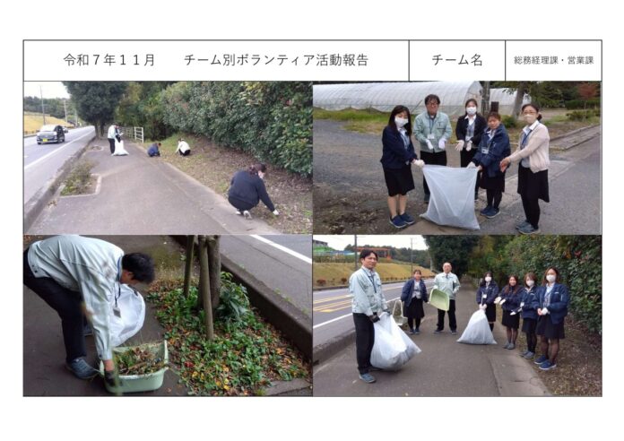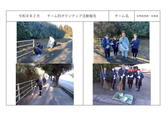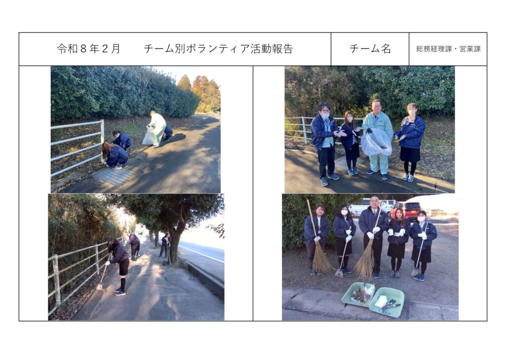 社内活動チーム別ボランティア活動<総務経理課・営業課> 社内活動チーム別ボランティア活動<総務経理課・営業課> チーム別ボランティア活動<総務経理課・営業課> 2025年12月11日 周辺地域の清掃作業をチームごとに行っております。<総務経理課・営業課> ◎2025年11月 ◎2025年10月 ◎2025年9月 ◎2025年8月 ◎2025年7月 ◎2025年6月 その他の記事 受入休止のお知らせ~12月15日(月)14:30~17:00 お知らせ 2025年12月11日 令和7年度 年末年始休業のお知らせと受入休止のお願い お知らせ 2025年12月11日 磯崎自治会主催「心と体の健康増進Fes.」ほかに協賛させて頂きました。 お知らせ 2025年10月6日 防災訓練のお知らせと受け入れ停止ご協力のお願い お知らせ 2025年10月3日 Recruit・募集中の職種 【プラント管理課・夜勤】career 【プラント管理課】new graduate 【総務経理課】new graduate 【事務職】career もっとロードする