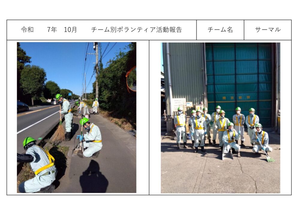 社内活動チーム別ボランティア活動<サーマルリサイクル課> 社内活動チーム別ボランティア活動<サーマルリサイクル課> チーム別ボランティア活動<サーマルリサイクル課> 2025年11月10日 周辺地域の清掃作業をチームごとに行っております。<サーマルリサイクル課> ◎2025年10月 ◎2025年9月 ◎2025年8月 ◎2025年7月 ◎2025年6月 その他の記事 磯崎自治会主催「心と体の健康増進Fes.」ほかに協賛させて頂きました。 お知らせ 2025年10月6日 防災訓練のお知らせと受け入れ停止ご協力のお願い お知らせ 2025年10月3日 勝田環境グループにて献血に協力させて頂きました。 お知らせ 2025年8月21日 Recruit・募集中の職種 【プラント管理課・夜勤】career 【プラント管理課】new graduate 【営業課】career 【総務経理課】new graduate もっとロードする