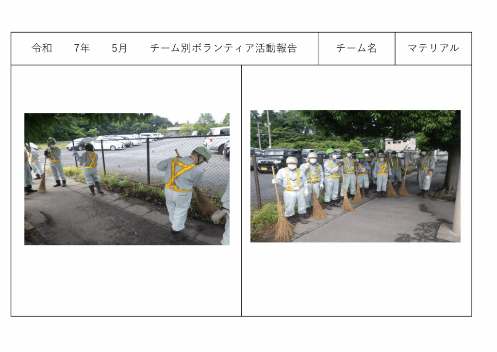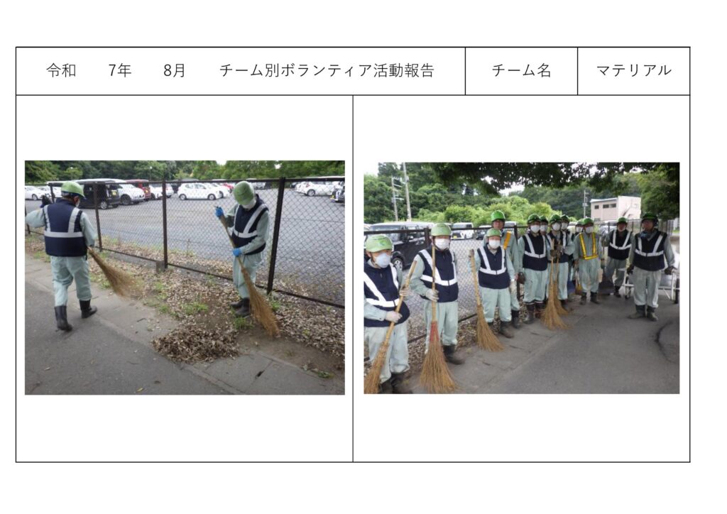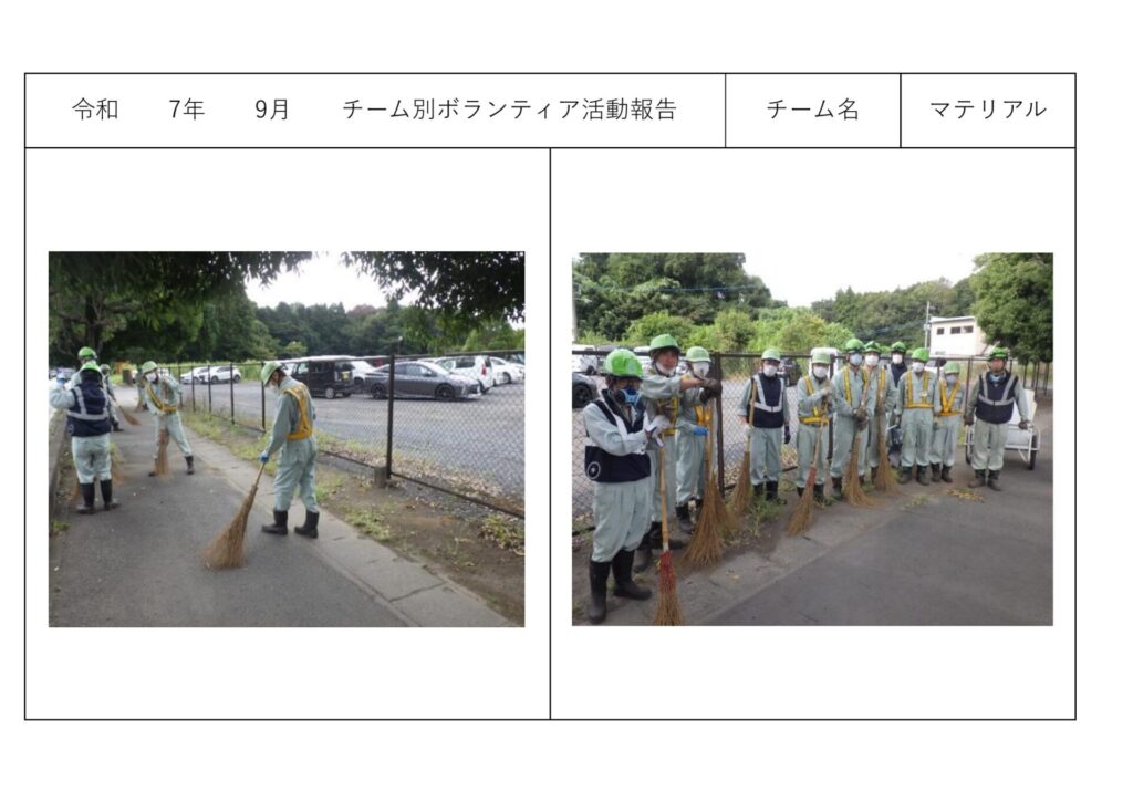 お知らせチーム別ボランティア活動<マテリアルリサイクル課> お知らせチーム別ボランティア活動<マテリアルリサイクル課> チーム別ボランティア活動<マテリアルリサイクル課> 2025年10月17日 周辺地域の清掃作業をチームごとに行っております。<マテリアルリサイクル課> ◎2025年9月 ◎2025年8月 ◎2025年7月 ◎2025年6月 その他の記事 チーム別ボランティア活動<総務経理課・営業課> お知らせ 2025年10月17日 チーム別ボランティア活動<サーマルリサイクル課> お知らせ 2025年10月17日 磯崎自治会主催「心と体の健康増進Fes.」ほかに協賛させて頂きました。 お知らせ 2025年10月6日 防災訓練のお知らせと受け入れ停止ご協力のお願い お知らせ 2025年10月3日 Recruit・募集中の職種 【事務職】career 【営業課】new graduate 【営業課】career 【プラント管理課・夜勤】career もっとロードする